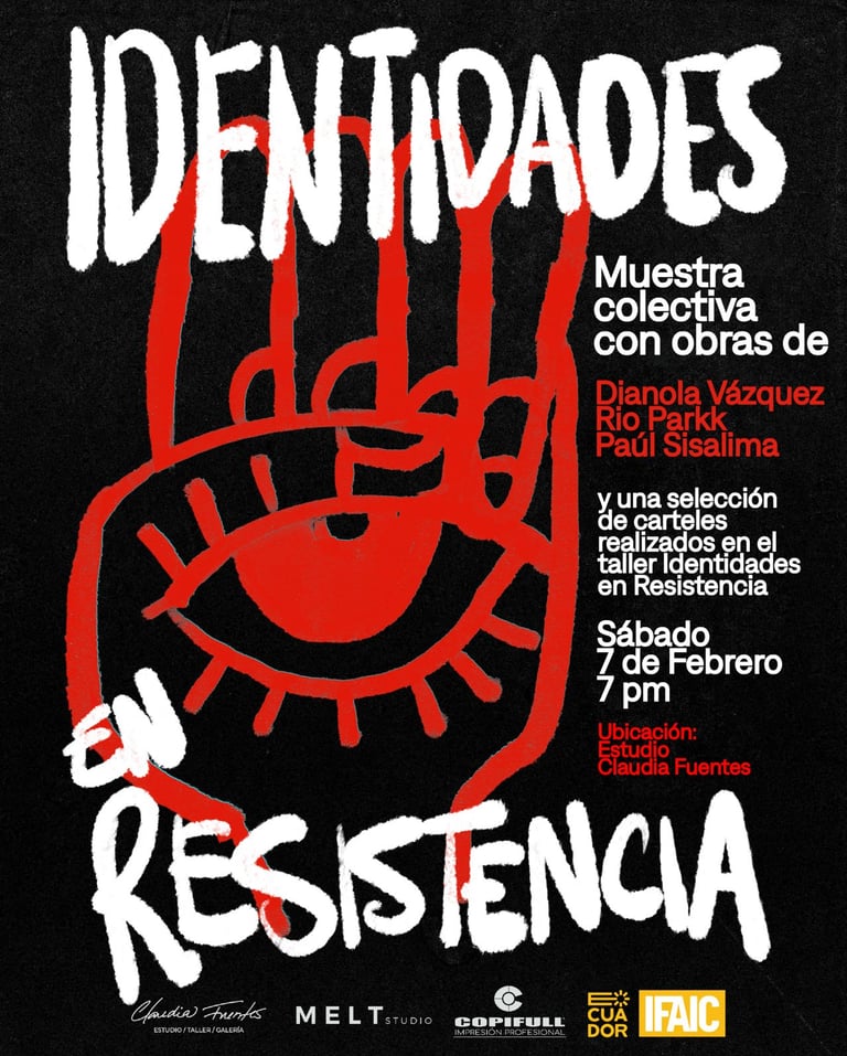 La exposición reúne obras de Dianola Vázquez, Rioparkk y Paúl Sisalima, junto a una selección de carteles realizados en el marco del taller Identidades en Resistencia, parte del proyecto La Frontera del Gesto, ganador de los fondos IFCI.